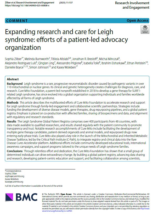 The Cure Mito Foundation is a leading patient advocacy organization dedicated to Leigh syndrome and mitochondrial diseases research and empowering affected families worldwide. We provide opportunities to connect, learn, and find resources, strength, and courage to live your best life.