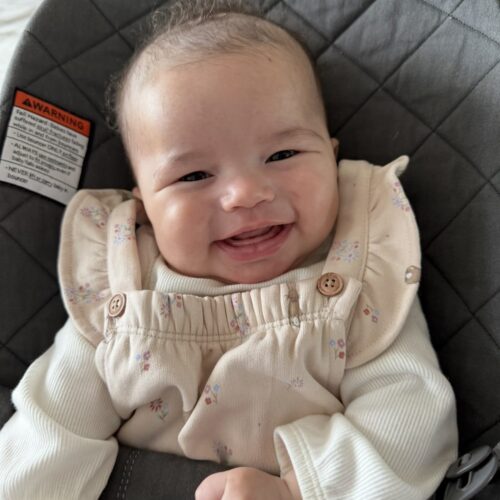 Zoë was the kind of baby who made people smile the moment they saw her. She had dark brown eyes that almost disappeared when she smiled, soft brown curly hair, and the sweetest chubby cheeks. Most of all, she had a joyful spirit. Zoë loved to squeal, coo, smile, and laugh. She also loved to make people laugh by blowing raspberries, which was her favorite thing to do.